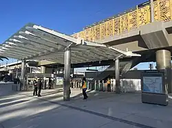 The station incorporates artwork by the artist Sherin Guirguis,[10] an Egyptian artist known for her work exploring cultural identity and lost feminist histories. The main component of the Aviation station art is a richly colored artwork for the platform and fence.[11] Filled with countless beautiful yellow designs and patterns. The artwork reflects the diversity of the surrounding neighborhood and the rest of Los Angeles County, representing those who migrated to the area. The bright color of the piece makes it conspicuous for drivers passing underneath the station.