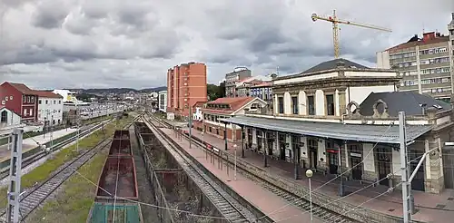 Aviles Station was opened in 1890, just 20 days after works on the railway connection between Villabona and San Xuan were completed by Norte.[2][3][4] In 1922, Ferrocarriles de Carreño took advange of the location of this station to extend its narrow-gauge line, thus connecting Avilés with Gijón via Aboño.[5] In 1941, the new Francoist regime nationalised all the Iberian gauge railways in Spain and Norte's assets into the newly formed Renfe.[6] In 1972, the ownership the narrow-gauge section was transferred to FEVE, a government-owned company established with the objective of operating all narrow-gauge railway lines within Spain.[7][8] In 2005, Adif became the owner of the infrastructure and the management of railway lines that were part of RENFE, which became a mere operator.[9] In a similar move, Adif took over the narrow-gauge section of this station in 2013 with the integration of Feve in Renfe and Adif.[10]