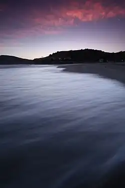 The main beach of the town, Avila Beach is less than 0.5 miles (0.8 km) long and sheltered in San Luis Bay, which is formed by Point San Luis on the west and Fossil Point on the east. Avila Beach faces south and the 600 foot elevation of Point San Luis breaks the prevailing northwesterly winds. It is therefore usually warmer than the other beaches on the Central Coast.