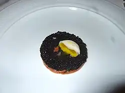Avruga is a product made from herring and other products (water, herring-40%, salt, corn starch, lemon juice, citric acid, xanthan gum, sodium benzoate, squid ink) that is marketed as a caviar substitute. Unlike caviar, it does not contain fish roe.