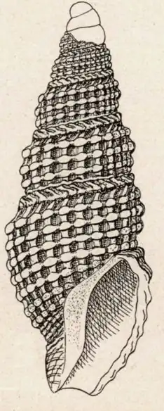 The spire is turriculate, not very conspicuously shouldered, longer than the body whorl. Protoconch: The outer shelly layer has scaled off and it is impossible to give a description. The nucleus is globular and obliquely tilted. The seven whorls are narrowly angled and excavated above, their sides almost straight. The base of the shell is convex and narrowed to a short and anteriorly sinuated beak. The suture is bimarginate, above by a minute threadlet, below by a broad and heavy cord which is obliquely irregularly plicated. The aperture is pyriform, angled above, with a concave inner wall, ending in a short broad canal, which turns slightly to the left. The outer lip is curved and imperfect The lines of growth would indicate that the sinus is situate in the excavation below the sutural cord, that it is small and moderately deep. The inner lip spread as a thin layer narrowly over the body, broader over the columella, which is first straight and then slightly twisted to the left, ending in a sharp point.[2]