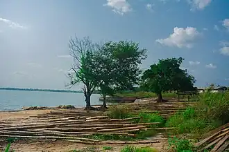 Logged wood and bamboo sticks heaped on the river bank of Awbana river, usually used for the construction of their wooden boat