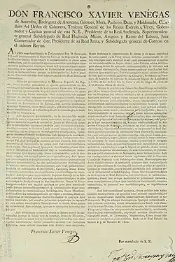 "Ayamo moyolpachihuitia in Totlatocatzin Rey D. Fernando VII..." ('Our ruler King Don Fernando VII is not yet satisfied') are the first words of a Nahuatl-language broadside printed on October 5, 1810, by Francisco Javier Venegas de Saavedra, viceroy of New Spain, as propaganda during the Hidalgo revolt. It announced the abolition of tribute payment by the Indians of New Spain, which, it was hoped, would reduce Indian support for the rebellion.