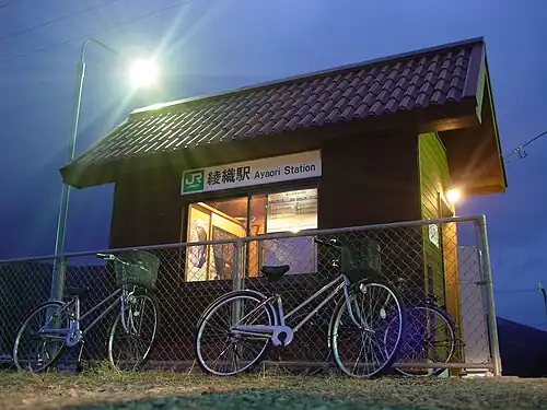 Ayaori Station opened on 15 December 1914 as a station on the Iwate Light Railway (岩手軽便鉄道), a 762 mm (2 ft 6 in) light railway extending 65.4 km from Hanamaki to the now-defunct Sennintōge Station (仙人峠駅).[1] The line was nationalized in 1936, becoming the Kamaishi Line. The station was absorbed into the JR East network upon the privatization of the Japanese National Railways (JNR) on 1 April 1987.