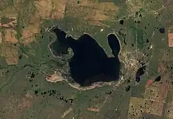 The lake is located on the Kazakhstan–Russia border. The border runs roughly from north to south and the largest part of the lake is in Kazakhstan, with only a small sector in the NW part within Russia. Ayke has an area of about 65 square kilometers (25 sq mi). The Kazakh village of Ayke[1] is located on the eastern lakeshore. Lake Shalkar-Yega-Kara lies about 30 kilometers (19 mi) to the southwest, on the other side of the border, and lake Kulykol 40 kilometers (25 mi) to the NNE.[2][3]