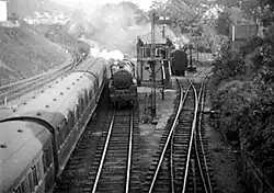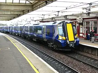 The line to Ayr was electrified and Class 318 electric multiple units introduced by British Rail in September 1986. The line was promoted as the AyrLine in Scotrail publicity. Along with the introduction of new trains, major work was undertaken refurbishing stations, major trackworks and rebuilding many bridges. At the same time resignalling was carried out, replacing the existing semaphore signals.[1] The full electrified service, including trains to Largs and Ardrossan Harbour, commenced on 19 January 1987.[1] These were supplemented by occasional use of Class 303 and Class 311 EMUs, then in use on the Inverclyde Line.