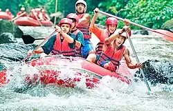 The Ayung River is considered an excellent place for family Rafting because the average power of falls (force 3)[6] allows you to enjoy an inflatable boat ride in the heart of the jungle. The rapids of most family routes (about 33 rapids) are class II and III[7] Moreover, the rafting routes offered on this river are open to those aged 5 to 65 years.[7] On the banks of the Ayung River, Chicco Tatriele and his wife set up a centre, built entirely of bamboo, dedicated solely to healing the body and mind.[8]