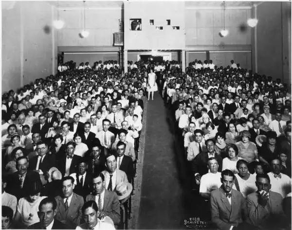 Jose Sarabia founded the Azteca Theater in 1927 next to "La Libreria Hispano America," a venue where mexican people congregated in Houston.[2] The Azteca outdid the Hidalgo theater which operated a few blocks away for a short time.[1] The Azteca was one of the most important theaters for the mexican community in the Bayou City[1]