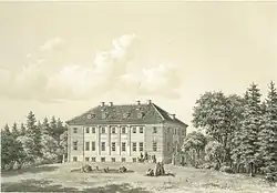 The main building is designed in the Neoclassical style. It consists of two storeys over a high cellar and has a rectangular floor plan. The central part of the southern facade features four Ionic pilasters. The building has sash window, an influence from English architecture. The hipped, black-glazed tile roof features four dormer windows on each side.[6]