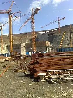 Construction work on the Búðarháls Hydroelectric Plant began at the end of 2001. After preparing the construction site in order to make it more easily accessible, the actual and official construction work began in November 2010, in which 65,000 m³ of concrete and 4500 tonnes of steel was used. Digging operations were finished in September 2012 and by the end of 2013 the powerhouse and intake structure were completed and the Sporðalda reservoir filled. After the reservoir and the dam were filled, the power station became operational and after some testing the hydroelectric power plant was officially brought online on 7 March 2014.[6][5]