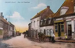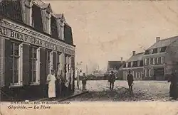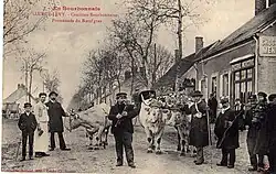 A postcard shows a float carrying a Bœuf Gras and three costumed people: a toreador and two picadors. It was part of the grand cavalcade organized in Eu on Easter Monday, April 20, 1908.[17] Another postcard shows the Bœuf Gras and Boîte au Sel marching in Eu that day.[18]