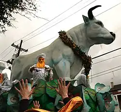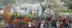 On the Internet, you can see a photo of a monumental Bœuf gras artificial parading on its float in the Krewe of Centaur (Centaur Carnival Society) procession during Shreveport Carnival 2009.[46]
