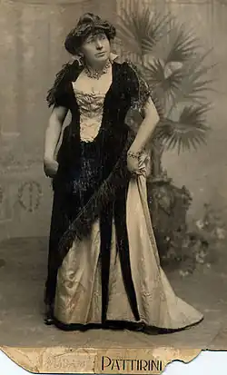 In 1885, Young, his wife, and their children returned from serving his second mission in the Hawaiian Islands. Shortly after returning to Utah, Young began publicly performing in drag as a cross-dressing singer under the pseudonym Madam Pattirini.[1][2][3] Young performed as Pattirini in north and central Utah venues from 1885 to the 1900s. He could produce a convincing falsetto, and many in the audience did not realize that Pattirini was Young. One of his performances as Madam Pattirini was for the last birthday celebration of LDS Church president Lorenzo Snow in April 1901.[4] He also once portrayed a "fine Irish girl" named Bridget McCarthy at a Christmas ball at the Salt Lake Theatre in 1886.[5]