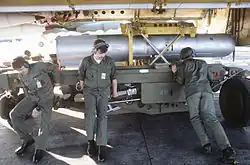 The B28, originally Mark 28, was a thermonuclear bomb carried by U.S. tactical fighter bombers, attack aircraft and bomber aircraft. From 1962 to 1972 under the NATO nuclear weapons sharing program, American B28s also equipped six Europe-based Canadian CF-104 squadrons known as the RCAF Nuclear Strike Force. It was also supplied for delivery by UK-based Royal Air Force Valiant and Canberra aircraft[3] assigned to NATO under the command of SACEUR. In addition, certain U.S. Navy carrier based attack aircraft such as the A3D (later A-3B) Skywarrior, A4D (later A-4) Skyhawk, and A3J (later A-5A) Vigilante were equipped to carry the B28.