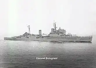BAP Coronel Bolognesi (CL-82) was a Fiji-class light cruiser in service with the Peruvian Navy. It was completed for the Royal Navy in 1943 as HMS Ceylon and, after being withdrawn from service, commissioned by the Marina de Guerra del Perú on February 9, 1960. Renamed BAP Coronel Bolognesi (CL-82), in honor of the Peruvian Colonel Francisco Bolognesi, it arrived at its new home port of Callao on 19 March 1960.