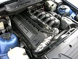 The E30 M3 used the BMW S14 four-cylinder engine, a high-revving DOHC design with a head closely based on that of the BMW S38 six-cylinder engine and the block from the BMW M10 four-cylinder engine with a 7,250 rpm redline.[10][12] In countries where the M3 was sold with a catalytic converter, the initial versions were rated at 143 kW (195 PS; 192 hp) and had a top speed of 235 km/h (146 mph).[13] In countries where a catalytic converter was not fitted, the engine was rated at 147 kW (200 PS; 197 hp).
