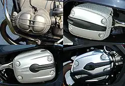 An "Oilhead" is a name to describe BMW flat-twin motorcycle engines with partial oil-cooling, and to distinguish these engines from the earlier air-cooled "Airhead" models.[16] The Oilhead's finned cylinders have conventional air-cooling, but the four-valve cylinder-heads are oil-cooled. Unlike earlier BMW boxers which had a single camshaft in the crankcase (variously above or below the crankshaft), the Oilhead has a camshaft in each head. (It is still technically an overhead valve engine rather than a true overhead camshaft unit, as the camshaft bears onto very short pushrods which operate valve rockers). In 2013, BMW introduced water-cooling to its boxer range.[17] The engine is still used in the BMW R nineT[18] line of motorcycles.
