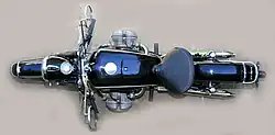 The rider's saddle is suspended with a large chrome plated spring and is connected directly to the rear saddle so the rider can slide backward and crouch at higher speeds. Rear foot pegs were normally included for the rider to use when sliding on the rear saddle to crouch for high speeds.