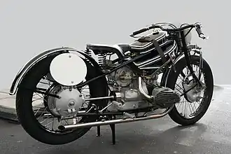 The engine was a longitudinally mounted flat twin four-stroke engine with overhead valves. The compressor was located on top of the gearbox, and in the first version was driven by an additional open parallel shaft next to the magneto with a right-angle bevel gear linkage.[4] Thus, the compressor shaft ran transversely to the direction of travel. The boost pressure was up to 2 bar depending on application. The tank was shortened compared to the series motorcycles to make room for the compressor. The single carburetor was located behind the compressor.