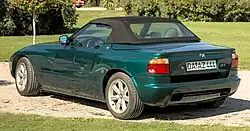 The BMW Z1 is a two-seat roadster developed by BMW and was produced from March 1989 to June 1991. It was based on the E30 3 Series platform.[3] The Z1 featured unusual doors which, instead of opening outward or upward, dropped into the door sills and had body panels which could easily be removed and replaced; the car could be driven with all its body panels removed for weight reduction and increased performance.[4] Only 8,000 examples of the Z1 were produced.[5]