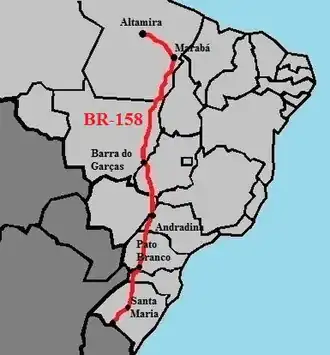 BR-158 is a federal highway of Brazil.[1] One of the longest highways in the country, the 3,955.0-kilometre (2,457.5 mi) road connects Altamira, Pará, to Santana do Livramento on the Uruguayan border where it joins Route 5 (Uruguay).[2]