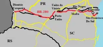 The BR-280 is a Brazilian federal highway that connects the cities of São Francisco do Sul, in the state of Santa Catarina, to Dionísio Cerqueira, Santa Catarina. It has a total length of 642.2 km.[1]