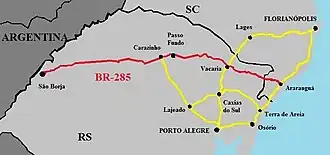 BR-285 is an east-west Brazilian federal highway that starts in Araranguá, Santa Catarina, and crosses the Gaucho range and highlands. It stretches approximately 674.5 km, passing through cities such as Vacaria, Lagoa Vermelha, Passo Fundo, Carazinho, Ijuí e São Luiz Gonzaga, and ends in São Borja, Rio Grande do Sul, on the border of Argentina.[2]