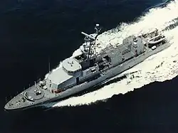Navigation systems include Global Positioning System and Loran receivers. Radio gear includes LST-5C SATCOM/line-of-sight UHF transceiver, A5 Spectra VHF radio, ICM120 Marine Band radio, and RF 5000 HF, VRC-92A VHF, and VRC-83(V)2 VHF/UHF transceivers. AN/SAT-2A infrared signaling systems are fitted, and the Marconi Vistar stabilized FLIR sensor with integral low-light-level television camera is mounted on the mast. Have IFF transponder but no interrogation capability, although it may be added later. The sonar transducer is retracted within the hull at speeds above 14 kn.[8][9][10]