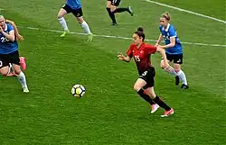 Başak Gündoğdu (red/black) attacking Estonia for Turkey national in the friendly match at TFF Riva Facility on April 7, 2018.