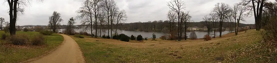 Babelsberg Park (German: Park Babelsberg) is a 114 hectare park in the northeast of the city of Potsdam, bordering on the Tiefen See lake on the River Havel. The park was first designed by the landscape artist Peter Joseph Lenné and, after him, by Prince Hermann von Pückler-Muskau and Karl Friedrich Schinkel,[1] by order of the then-prince William I and his wife, Augusta. Located on a hill sloping down to the lake, the park and castle are part of the Palaces and Parks of Potsdam and Berlin, which were inscribed on the UNESCO World Heritage List because of their unique architecture and testimony to the development of landscape design.[2]