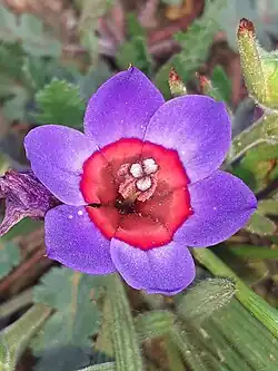 Babiana rubrocyanea is a perennial geophyte of 5–15 cm (2.0–5.9 in) high, with entire, lance-shaped, hairy, pleated leaves and flowers that have a narrowly funnel-shaped tube at their base and six free tepal lobes at the top that form a wide cup that is purplish blue with a sharply defined carmine red centre. It can be found in a small area of the Western Cape province of South Africa. Flowers can be found from August to the middle of September. It is called blue-and-red babiana in English and rooibloubobbejaantjie in Afrikaans.[2]