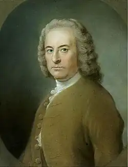 Matthew Babington married Elizabeth Galbraith, the daughter and heiress of Colonel James Galbraith, MP.[1] Matthew had three sons: Captain William Babington of Urney (1651-1702), who was a Captain in the Derry Garrison during the Siege of Derry in 1689[40] and who appears in George Frederick Folingsby's painting 'The Relief of Derry',[41][1] Thomas Babington (who owned land in Lifford) who married Isabella Stronge[1] and Captain Richard Babington of Mullagh (1659-1749) who married Isabella Wray, daughter of William Wray (son of Henry Wray and Elizabeth Gore) and Angel Galbraith (a sister of Elizabeth who married Matthew Babington).[1] Richard Babington was a Captain of Dragoons in the Irish Army of William III of England and he fought in the Battle of the Boyne.[1]