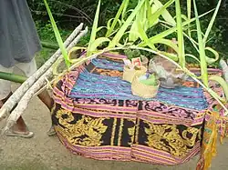 The "oldest" houses of Beli and Daralari can be traced back to two brothers, whose direct lineage derives from the mythical Founder of the ancient Realm of Bubulu. According to the stories of the Daralari people, the mythical ancestors came from the sea and took over "the entire land, touched by the Sun". The ancestral names of both Aldeias' lineages are held sacred and therefore must not be spoken out loud. They derived from the origin of the houses and are kept secret from outsiders. The names of modern Aldeias are used in everyday life and during local ceremonies. The ruling houses of Daralari are also called Uma Buti (white house) and Uma Ita (black house).[18] The associated shrines were rebuilt in 2000, once the Indonesian occupation had ended. Although the Uma Buti shrine is owned by the Daralari, it belongs to the entire community of the Suco. Uma Ita, the lower-ranked shrine, is referred to as the ruling house, where the traditional symbols of the Daralari political power (rotan) were kept to be later distributed to subordinate houses. Both shrines keep sacred looms, which once belonged to the legendary ancestors. It is believed that the looms carry the essence of the ancestors, and that the ancestors themselves live within certain parts of the shrines. During ceremonies, food, water, betel nuts (bua), betel leaves (malu) and other offerings are deposited in these sacred locations, and are later distributed back to the community. The nuts and leaves are said to have special protective powers. During community ceremonies and healing rituals, they serve as a symbol for community members and as protection for outsiders.[19] Beli has only one main house, simply referred to as Um Luli (sacred house). According to the local legend (Naueti: tete bo'ona, literally the oldest story) the brothers are said to have lived near the Baha Liurai (The Hill of the Ruler). However, the brothers started fighting, as the elder Beli was said to have abandoned his duties, much to the younger Daralari's dismay. Thus the elder brother lost his privileges and had to abandon the Sacred Land, while Daralari rose to be the leading lineage of the Ancestors.[20]