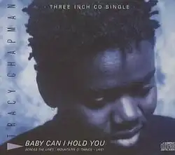 "Baby Can I Hold You" is the third single released by American contemporary folk artist Tracy Chapman, released in October 1988. The song reached the top 50 in the United States, unlike its predecessor, "Talkin' 'bout a Revolution", but it failed to become Chapman's second top 40 hit, peaking at number 48. It did, however, give her a second chart entry on the US Adult Contemporary charts, peaking at number 19 in early 1989. Given the commercial decline Chapman suffered following the release of her second album Crossroads, "Baby Can I Hold You" also became her last top 50 hit until 1996's "Give Me One Reason". In July 1990, the song reached number one in Portugal. Chapman re-released the song in 2001, in support of her first greatest hits album Collection.
