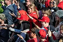Professional baseball player Gerardo Parra of the Washington Nationals, having discovered the song through his young daughter, adopted it as his walk-up music to energize the flagging team on June 19, 2019.[49] The theme became popular among both teammates and fans, who used the shark clap whenever the Nationals got a hit, and eventually, at every Parra at-bat; fans also began wearing shark costumes to the stadium.[50] A stuffed baby shark was seen attached to the dugout railing during the 2019 National League Championship Series, which the Nationals won over the St. Louis Cardinals.[51] During the 2019 World Series between the Washington Nationals and the Houston Astros, the song was the subject of a singing bet between the Choral Arts Society of Washington and the Houston Chamber Choir, with the condition that the Houston Chamber Choir would sing Baby Shark if the Washington Nationals won the World Series and the Choral Arts Society would sing Deep in the Heart of Texas vice versa.[52] After the Houston Astros lost the World Series in seven games, the Houston Chamber Choir honored its promise by singing Baby Shark in its rendition and posting the video on its YouTube official account.[53] The Choral Arts Society, though winning the bet, returned the honor by performing live on TV a mashup rendition of Baby Shark and Deep in the Heart of Texas.[54] The craze of Baby Shark among Washington Nationals' fans culminated after the team's win; the connection was such that the Marine Band performed the song during the team's celebratory visit to the White House.[55]