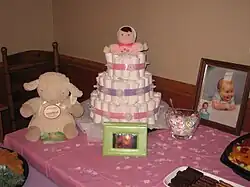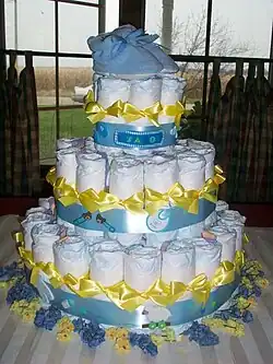 Some baby showers are directed at fathers. These may be more oriented towards drinking beer, watching sports, fishing, or playing video games.[13][14] The primary nature of these gifts is diapers and/or diaper-related items.[15][16] The organization of the diaper party is typically done by the friends of the father-to-be as a way of helping to prepare for the coming child. These parties may be held at local pubs/bars, a friend's house, or the soon-to-be grandfather's house.[15][17] In the United Kingdom, this is called wetting the baby's head, and is generally more common than baby showers. However, with the growth of American cultural influence – accelerated through celebrities via social media sites like Instagram – baby shower decorations are becoming more common in the United Kingdom.[18] Wetting the baby's head is traditionally when the father celebrates the birth by having a few drinks and getting drunk with a group of friends.