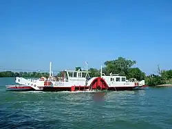 The current ferry boat, Bac Sauvage 3, was placed in service in 1972, and can carry up to 8 cars with 30 passengers plus a crew member.[4] The boat is 28 metres (92 ft) long and 5 metres (16 ft) wide. Whilst guided by cables, the ferry is propelled by paddle wheels. This unusual arrangement was shared with the Number 7 Dartmouth Higher Ferry in England. This operated from 1960 to June 2009, but has now been replaced by a new, more conventional cable ferry.[1]