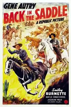 Back in the Saddle is a 1941 American Western film directed by Lew Landers and starring Gene Autry, Smiley Burnette, and Mary Lee.[2] Written by Richard Murphy and Jesse Lasky Jr., the film is about a singing cowboy who attempts to bring peace between ranchers and the operator of a copper mine whose chemicals are poisoning the area's water supply.[1] The film features several of Autry's hit songs, including "Back in the Saddle Again", "I'm An Old Cowhand", and "You Are My Sunshine".[1]