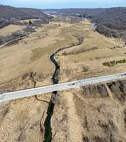 The Bad Axe River flows for its entire length in western Vernon County, and for most of its length as two streams, the North Fork Bad Axe River and the South Fork Bad Axe River. The North Fork rises at the town of Westby and flows generally southwestwardly for 31 miles (50 km).[1] The South Fork rises about 3 miles (5 km) south of Viroqua and flows westwardly for 16 miles (26 km).[1] The main stem of the Bad Axe flows for less than 5 miles (8 km) westward from the convergence of the two forks to its confluence with the Mississippi, about 6 miles (10 km) south of Genoa.