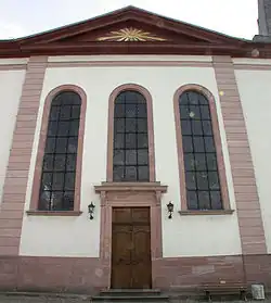 St. Peter's and St. Paul's Catholic Church stands in the Old Town's northwest. A “Saint Peter’s Church” (St. Peter Kirche) in Camberg had its first documentary mention in 1156. The oldest part of today's church is the tower built in 1580. After the nave collapsed in the 18th century, a new church had to be built. It was built by the Dillenburg building inspector Johann Friedrich Sckell in the Zopfstil (a late Rococo and early Classicism development), and is therefore one of the few examples of this building style in the region. The Electorate of Trier Auxiliary Bishop Johannes Maria von Herbain consecrated this church on 15 July 1781 in honour of the Apostles Peter and Paul.[15]