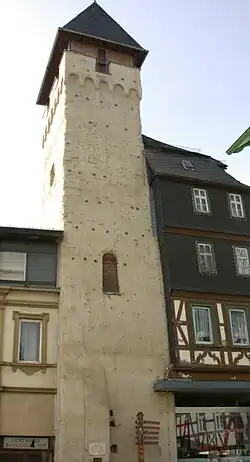 The Untertorturm is known locally as the Schiefer Turm von Bad Camberg (“Leaning Tower of Bad Camberg”), a name that owes itself to a lean of 1.44 m over a height of 21 m. On its base once stood three gates in a row. Its old cupola was destroyed in 1945 as the Second World War neared its end.