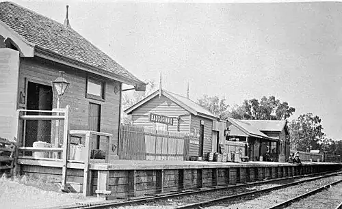 The station opened on 19 June 1882 for goods, and on 3 July of that year for passenger traffic.[1] A new platform, station building and goods shed were provided in 1908, and these remained until the 1960s, when it was rebuilt to allow the standard gauge line to run through the goods shed. The broad gauge crossing loop was extended and a new signal box was provided, along with a replacement goods siding and shed behind the platform.[1] The station remained open to passengers until 5 July 1978, when with the introduction of the Winter Timetable, it was closed completely.[2] By the end of July 1979, the goods shed and the livestock yard were dismantled,[3] with the station completely removed by October of that year.[4] The goods platform was still visible in 2008.[5]