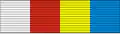 The badge for individuals is in the shape of a medal made of metal in the color of oxidized silver, with a diameter of 40 mm. On the main side there is the emblem from the coat of arms of Podlaskie Voivodeship, on an oval, red enameled shield, enclosed by a wreath of two stylized laurel branches with a tie at the bottom with a rectangular eyelet for hanging at the top, in the break in the wreath. The reverse side is smooth, with the consecutive number of the badge placed inside; the whole surrounded by the inscription in capital letters FOR MERITS FOR THE PODLASKIE VOIVODESHIP. The badge is worn suspended on a grosgrain, four-color ribbon, 36 mm wide, in the colors of the flag of the Podlaskie Voivodeship, with stripes of equal width placed vertically; from the left: white, red, yellow and light blue. On the reverse of the ribbon at the top there is a strip of metal as above, with a "safety pin" fastening. The badge for entities that are not natural persons has the same appearance as the individual badge, except for the diameter - 70 mm.[4] It also does not have an ear at the top or a ribbon.
