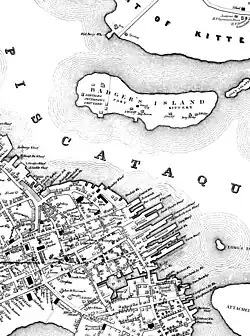 Prior to the Civil War, Badger's Island was famous for shipbuilding. Eastern white pine for masts, together with lumber for hulls, arrived down the Piscataqua River from inland forests. Only two tenths of a mile (322 m) from Portsmouth's busy wharves, the island's gradual slope into the deep channel between was ideal for launching vessels. First called Rising Castle Island, it changed to Langdon's Island when John Langdon established his shipyard. The first U. S. Navy ships commissioned by the Continental Congress were built here by master shipbuilder James Hackett,[1] including USS Ranger in 1777.[2] One of his apprentices working on Ranger was William Badger.[3] Acquiring 3 acres (12,000 m2) on the island in 1797, he would dominate its shipbuilding until his death in 1830, launching more than 100 ships,[3] including naval vessels, merchant vessels and privateers. The region produced many fine shipbuilders, including his nephew Samuel Badger, but William Badger, called Master Badger, is best known. He is buried on the island that bears his name.