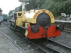 The first ships used Joseph Treffry's artificial harbour at Par on the south coast of Cornwall in 1833. It was fully operational by 1840, when it was linked to his inland mines and quarries by a canal up the valley to Ponts Mill, where it connected with inclined tramways to Treffry's copper mines and granite quarries. The canal was supplemented by a horse-drawn tramway to Ponts Mill in 1855, while a separate tramway incline served the Par Consols mine on the hill behind the harbour. In 1860, a connection was made to the recently opened Cornwall Railway which was carried on a viaduct and embankment between the harbour and mine. The mine closed in 1869 and the main tramway was converted to locomotive haulage as the Cornwall Minerals Railway in 1874, but wagons continued to be moved by horses within the harbour complex.[1] Several years later a branch line was taken through an 8 feet (2.4 m) bridge beneath the Cornish Main Line to serve new china clay processing works. As well as the very low bridge, this line had a tight 70 feet (21 m) radius curve; these two restrictions had to be taken into consideration when buying locomotives to work at the harbour.[2]