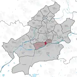 Location of the Bahnhofsviertel (red) and the Ortsbezirk Innenstadt I (light red) within Frankfurt am Main | |