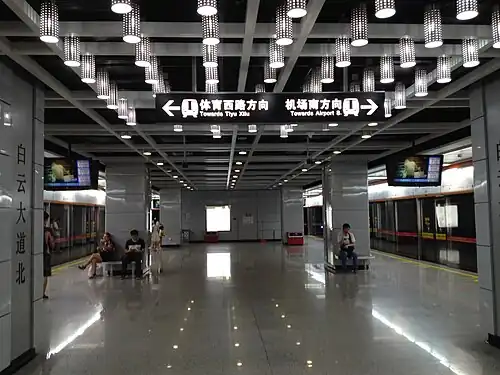 Baiyundadaobei station (simplified Chinese: 白云大道北站; traditional Chinese: 白雲大道北站; Cantonese Yale: Baahk'wàhn Daaihdouh Bāk Jaahm), formerly Yongtai station (永泰站) during planning,[1] is a metro station on Line 3 of the Guangzhou Metro. The underground station is located at the intersection of Guangcong Highway (广从公路) and Jianpeng Road (尖彭路) in the Baiyun District. It started operation on 30 October 2010.[2]