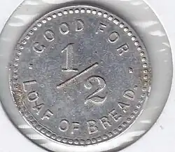A bakery token is a form of commercial token sold by and used in bakeries in the United States and postconfederation Canada primarily in the late 19th and early 20th century.[1][2][3][4] The tokens, usually made of brass, copper or aluminum, were given in lieu of change as a way of encouraging customers to return to the store.[1] They were also given to suppliers in smaller locations as partial payments.[1][5] They came in denominations of 1/2, 1, and 2 loaf.[6]
