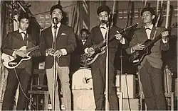 Baksey Cham Krong was formed in 1959, with Mol Kagnol, his brother Mol Kamach, and Samley Hong. The Mol brothers were from a wealthy family and were able to listen to Western radio stations, becoming influenced by singers Paul Anka and Pat Boone, plus the guitar-driven music of The Ventures and Chuck Berry.[3] Mol Kagnol, 14 years old at the time and nicknamed "Uncle Solo," played lead guitar while Kamach performed vocals.[1][4][2] They likened themselves to Cliff Richard and The Shadows, and modeled their stage presence after Richard's 1961 movie The Young Ones.[1]