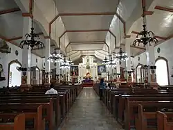 The church falls under the Baroque architecture. It is made of lime, bricks, and stone.[3] Across the three-story facade is four pairs of columns and lantern-like finials with two acroterium on top of angular piers on the column's end. Its pediment ends up in a small scroll. A separate bell tower is found adjacent to the church.[1] On the ceiling of the main altar is the murals of the Four Evangelists. On the right side of the main altar is the altar for the Our Lady of Namacpacan and on the left side is the altar for Saint Nicholas of Tolentino.